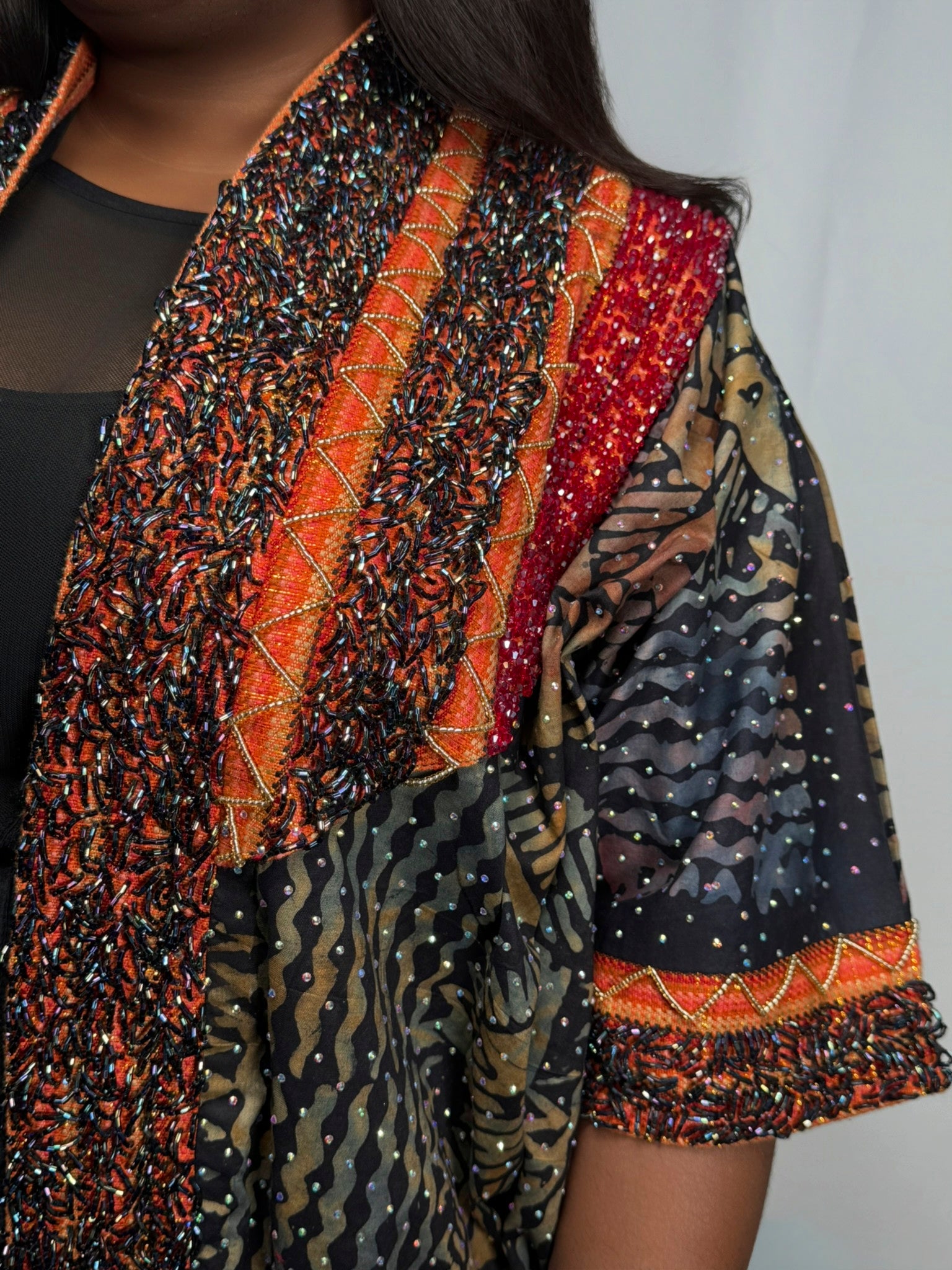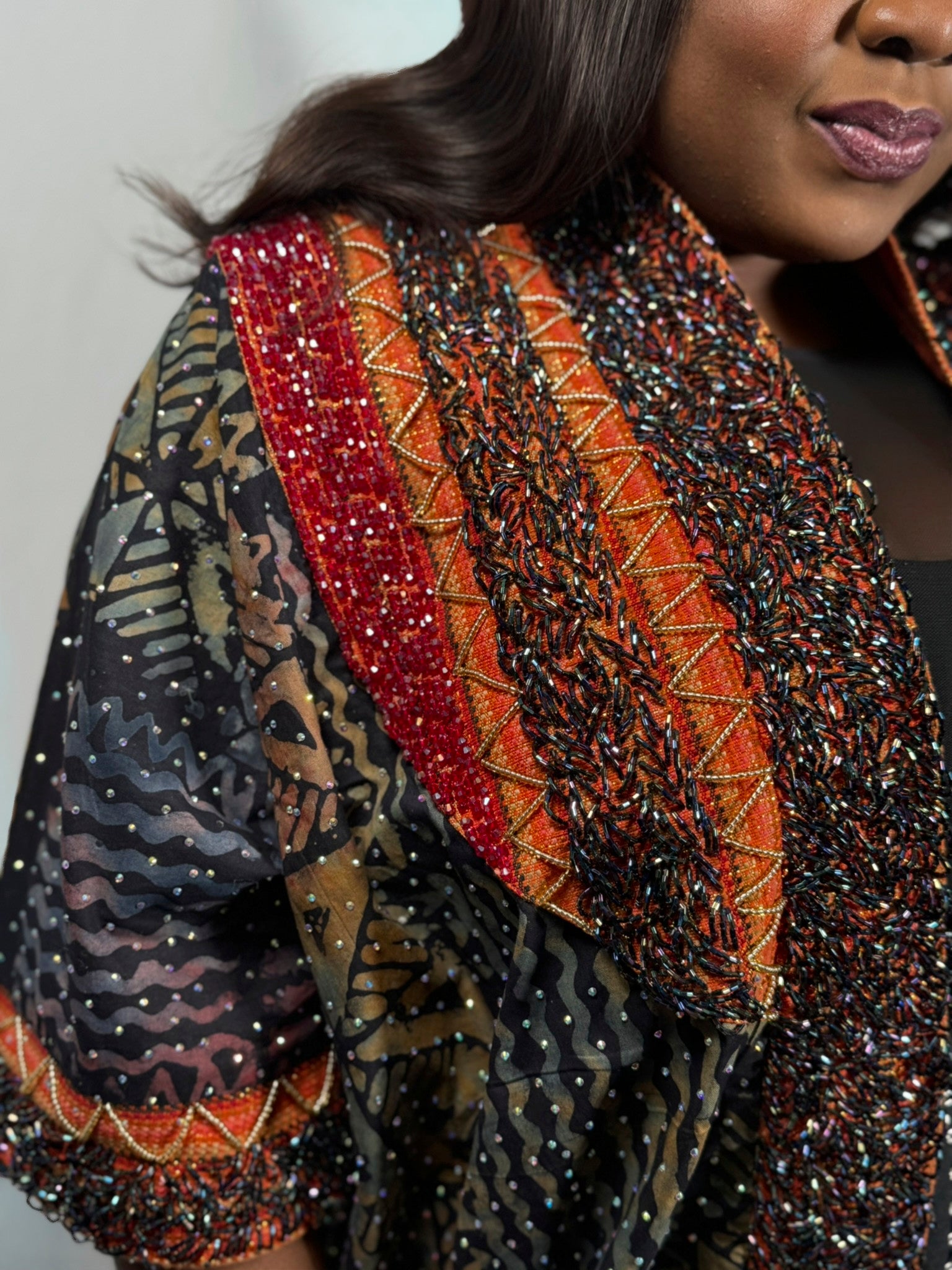 Drape yourself in regal elegance with our Adire & Aso-Oke Beaded Kimono, a stunning blend of hand-dyed Nigerian Adire, woven Aso-Oke, and exquisite hand-applied embellishments. This jacket is a wearable work of art—featuring intricate beadwork, shimmering stones, and vibrant textures that capture light and attention at every angle.