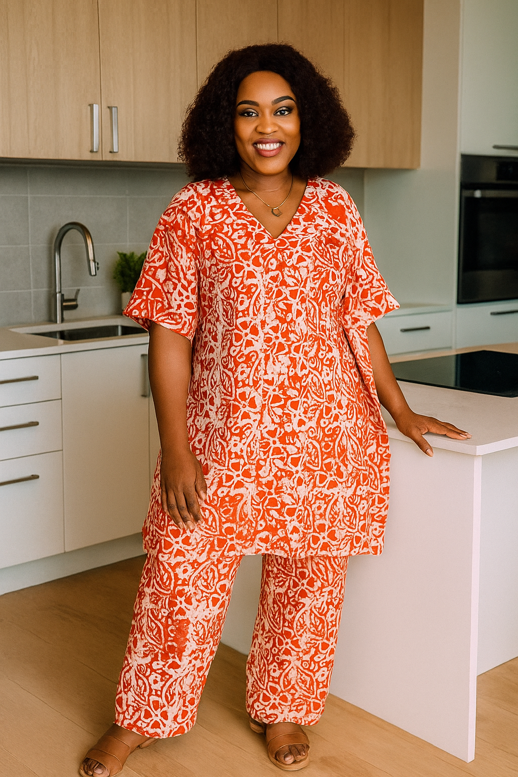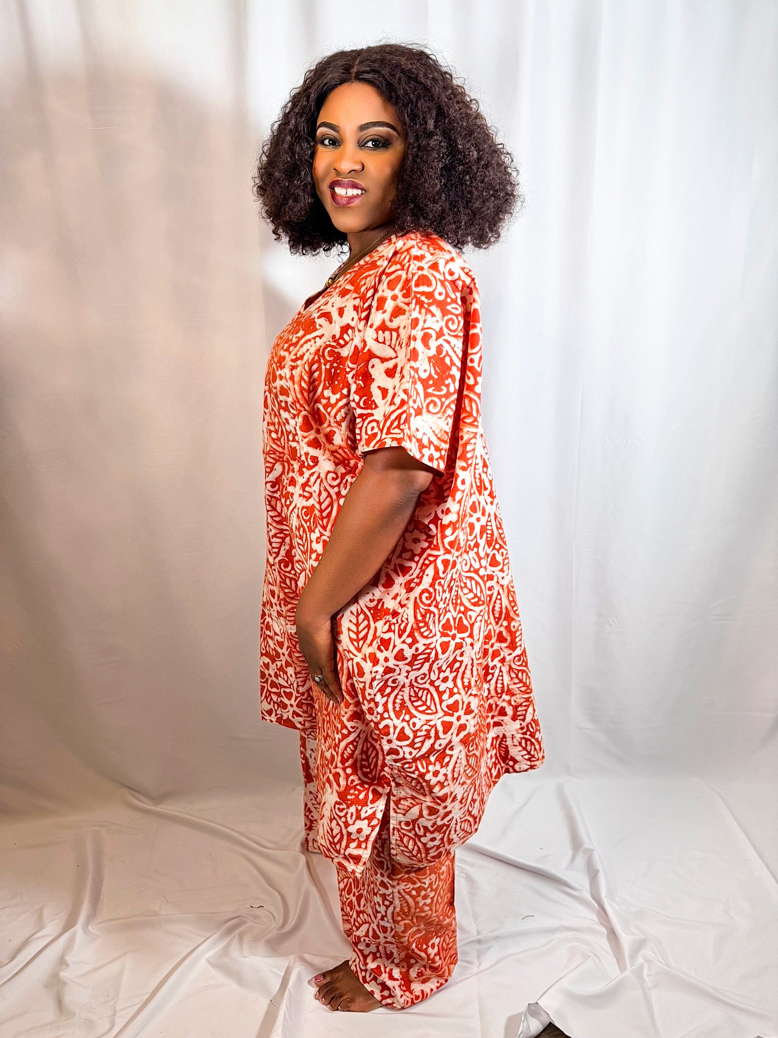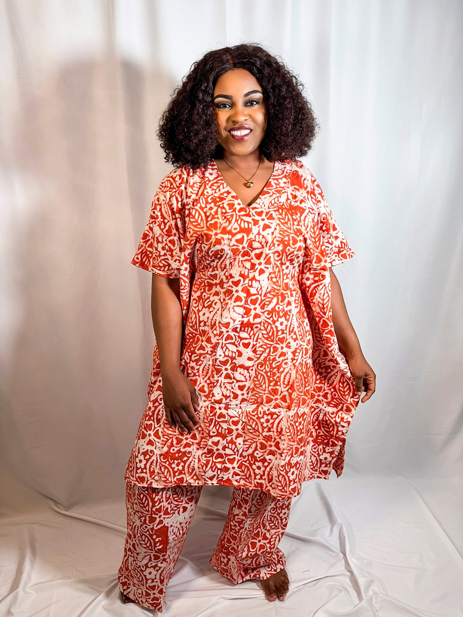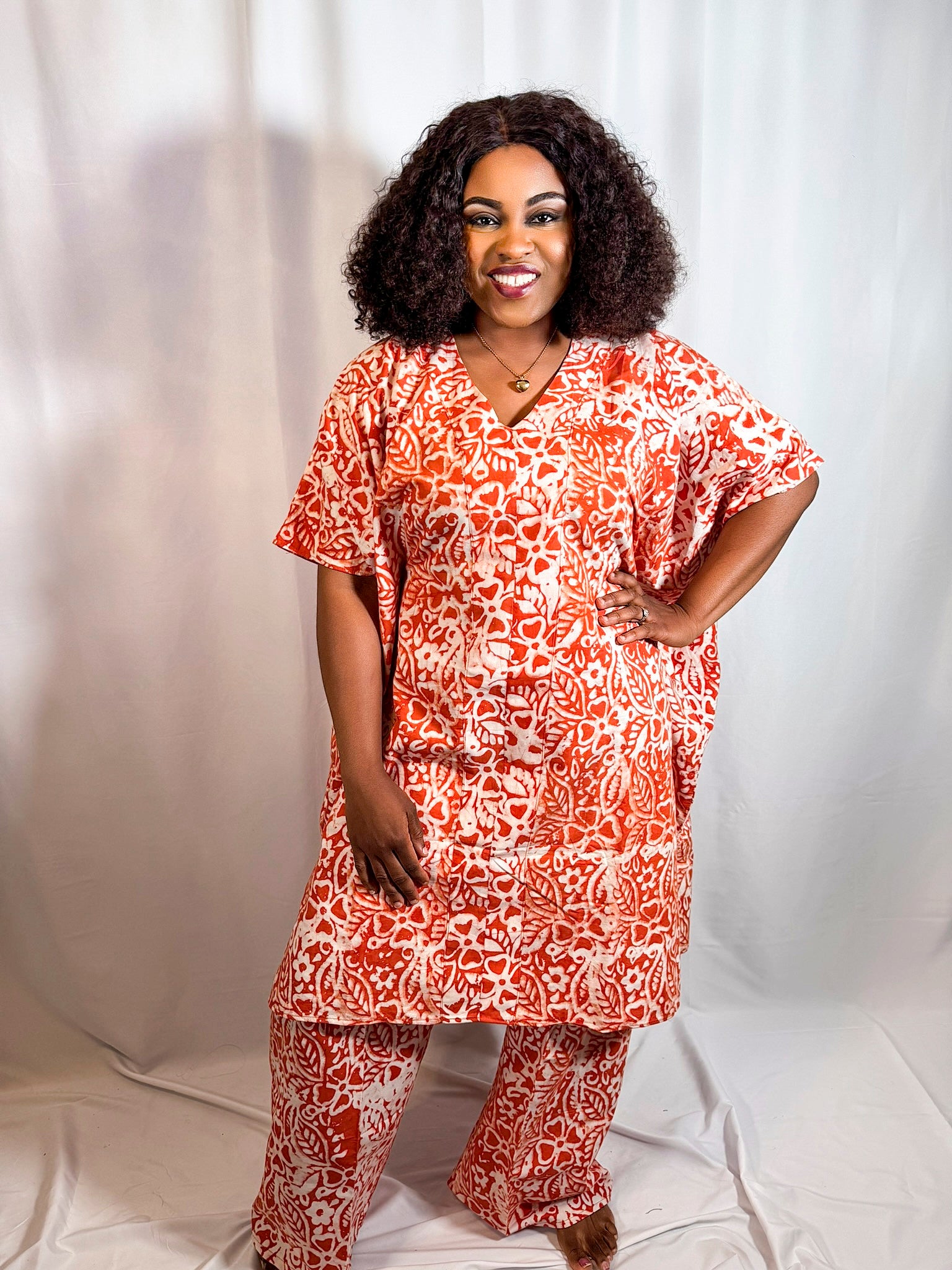 Make a bold cultural statement with our Adire Crepe Agbada Set. This two-piece set features a flowy agbada-style top layered over flattering wide-leg pants, both crafted from lightweight crepe fabric.