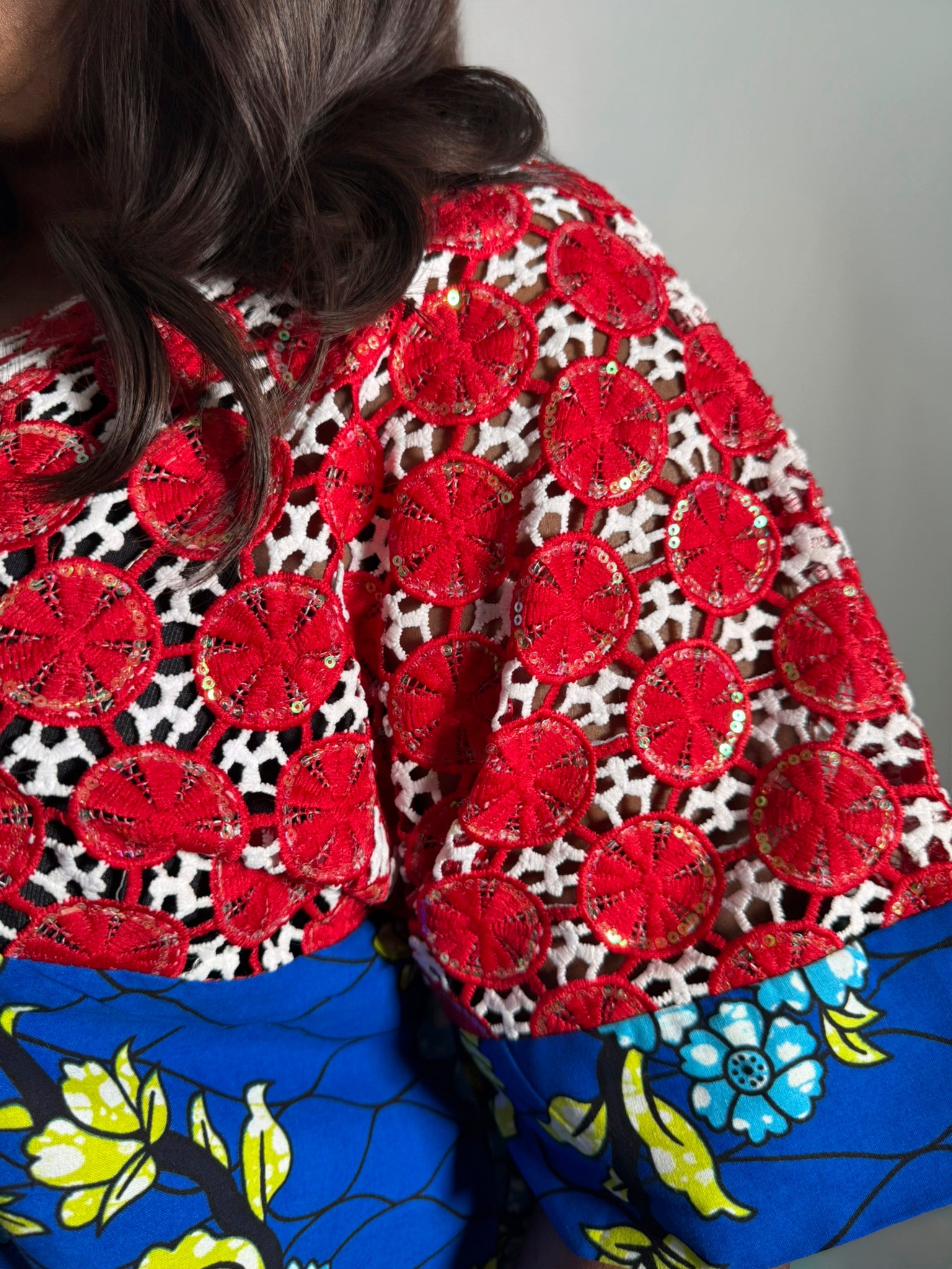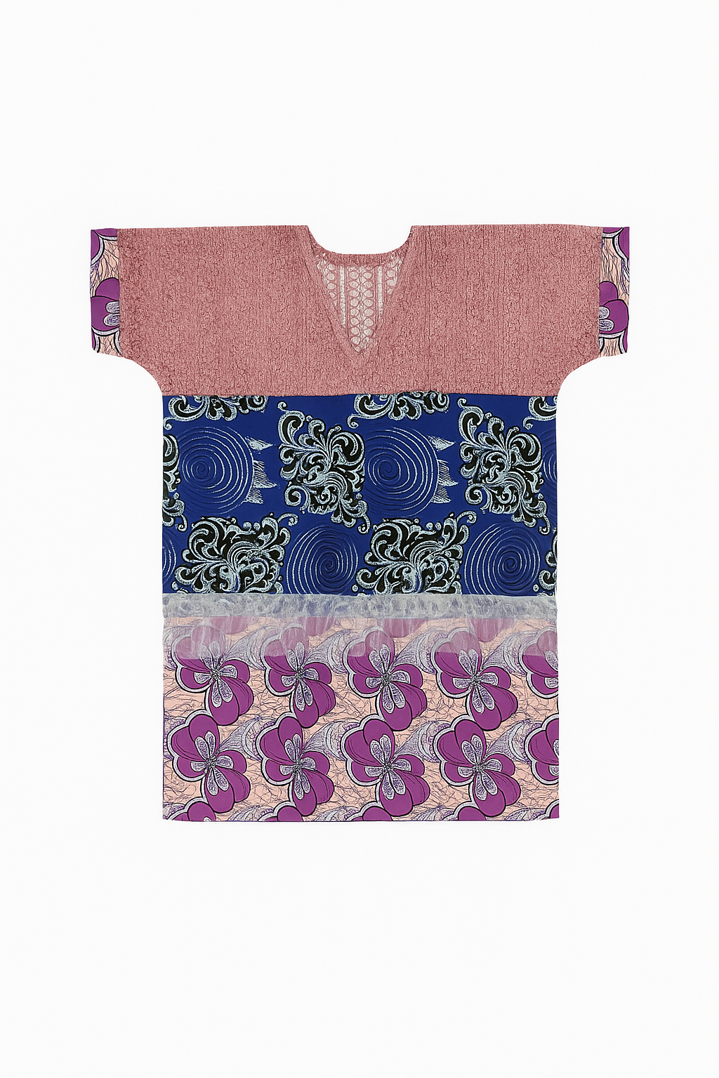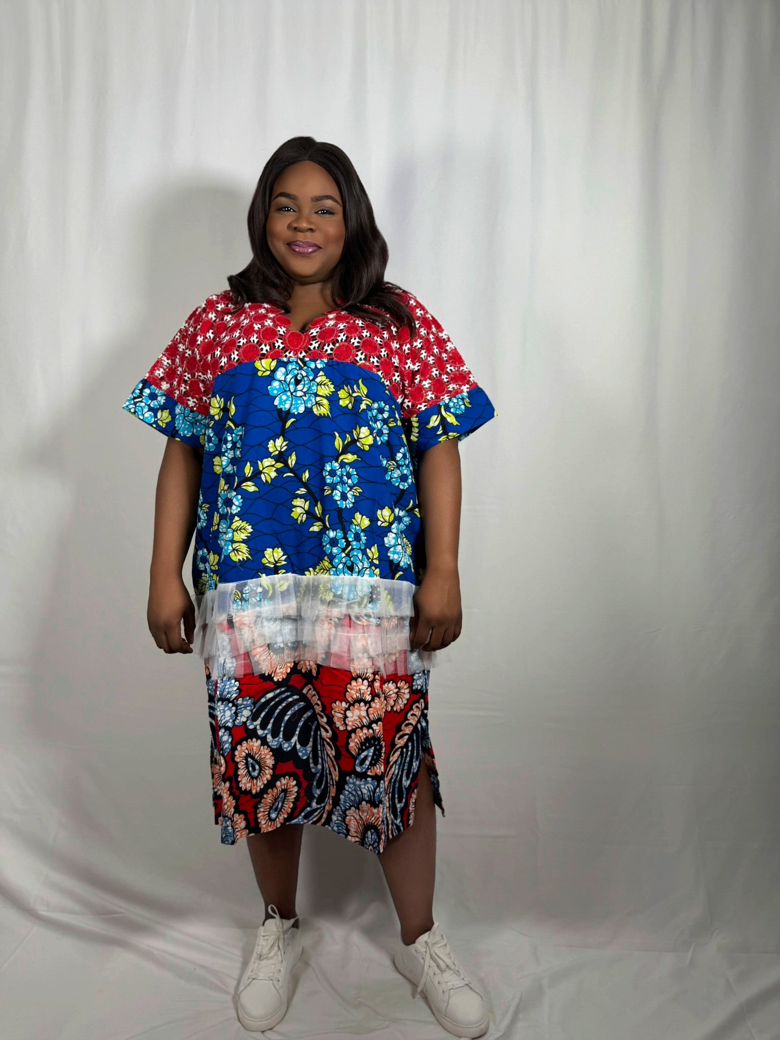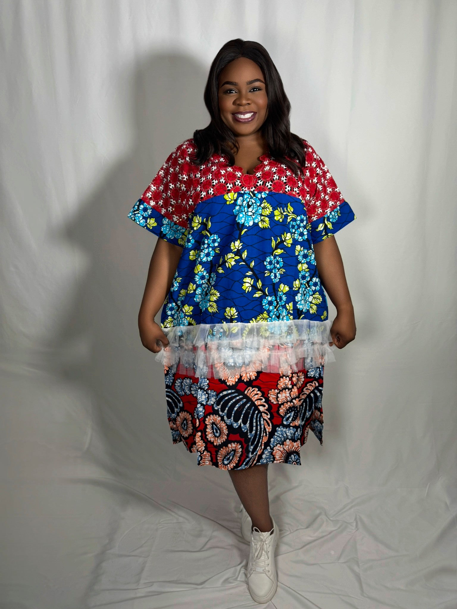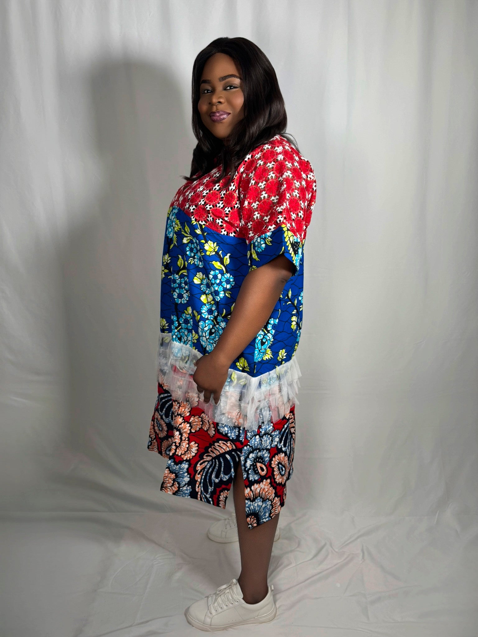 Make every moment a fashion statement in our Multi-Print Ankara Dress with Chord Lace Detail – a joyful blend of color, print, and texture. Designed with two stunning Ankara patterns in a tiered layout, wide sleeves, and a chorded lace trim that adds feminine flair to the top of the dress