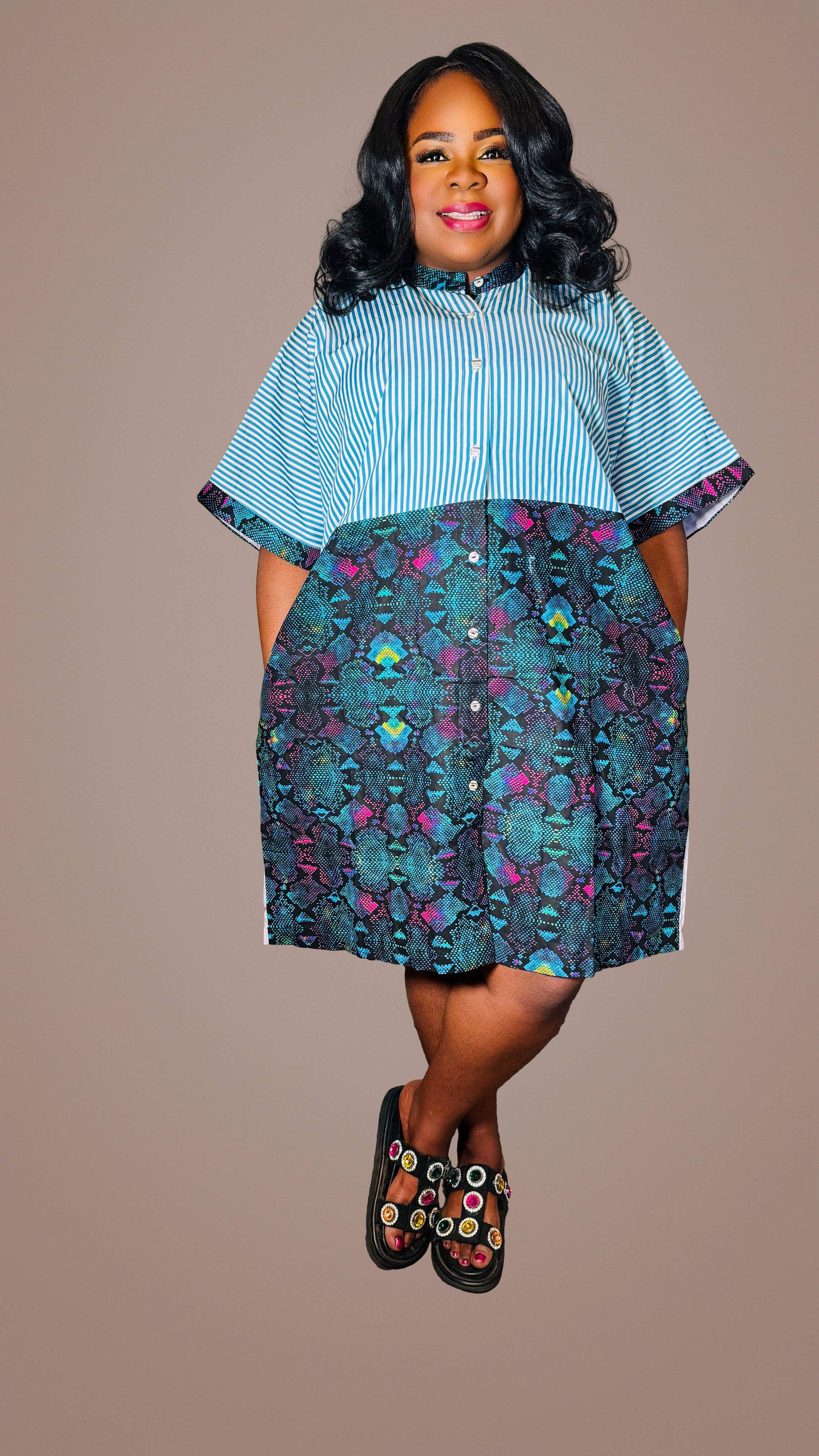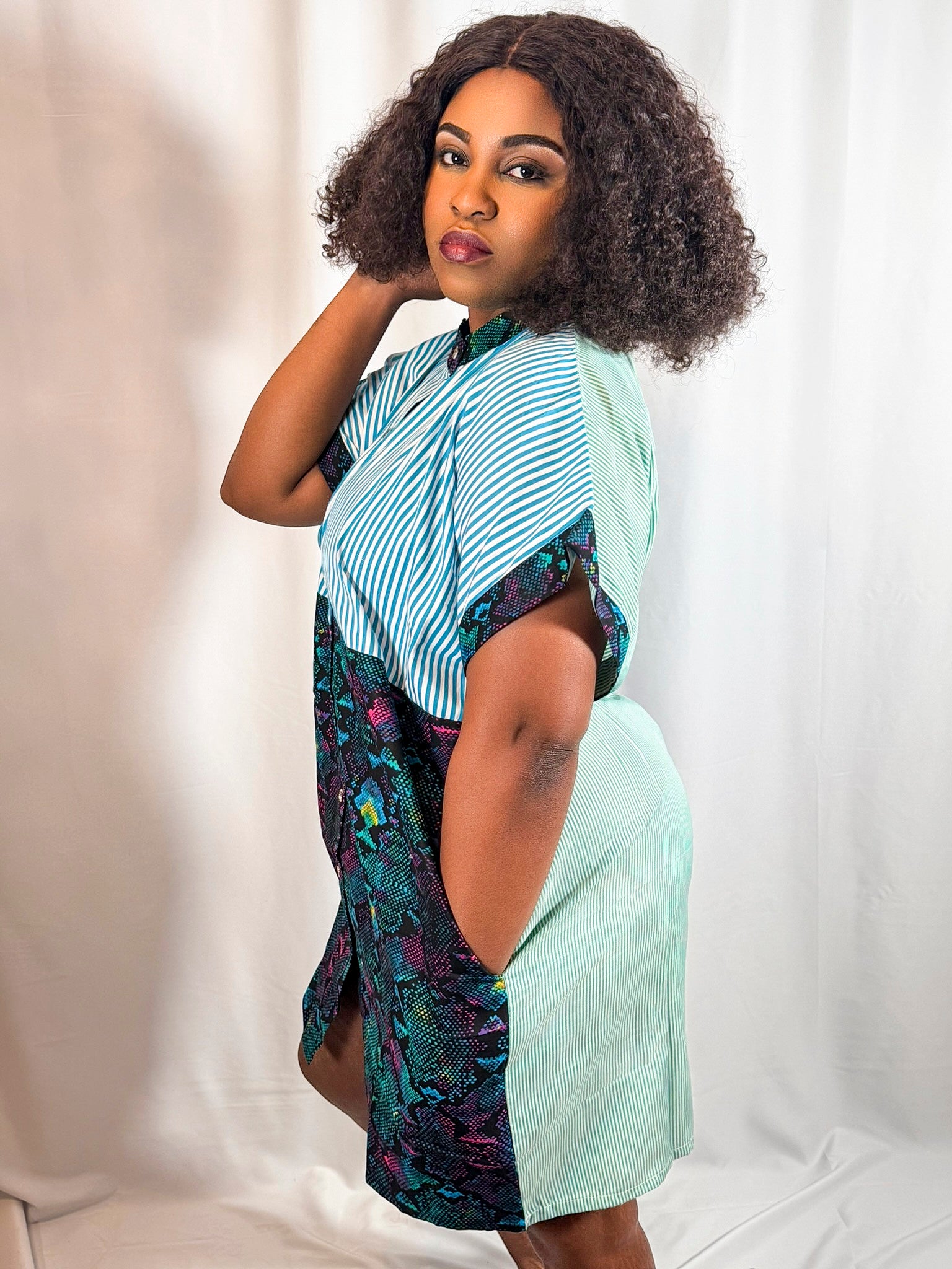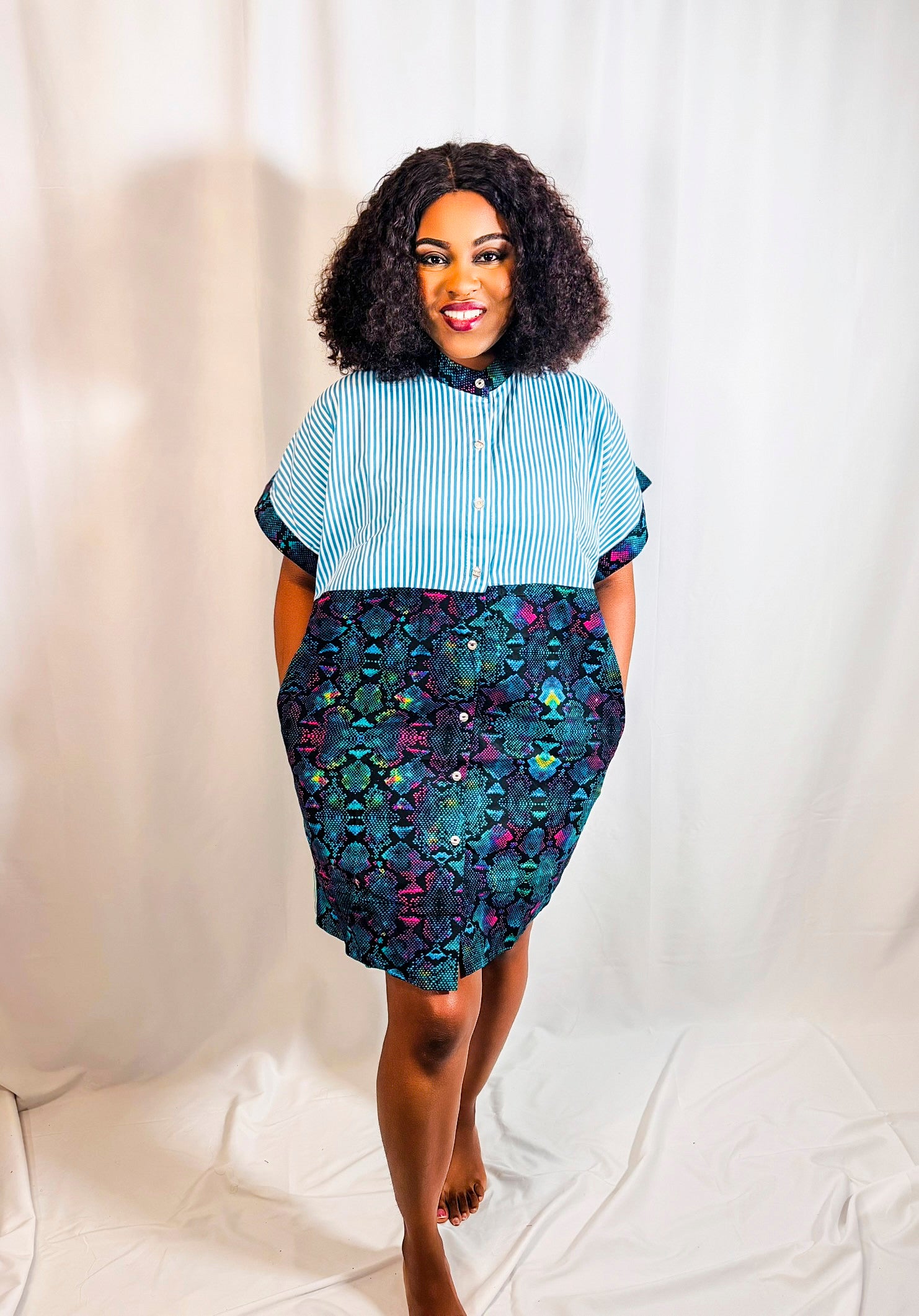 Meet your new wardrobe staple: the Striped & Ankara Shirt Dress, a playful blend of crisp shirting style and bold African print. Designed with two tones of striped cotton fabric on the front and back, and a statement Ankara panel on the lower half, this dress brings structure, ease, and personality in equal measure. The silhouette is relaxed but sharp—with short sleeves, a classic collar, front buttons, and functional side pockets for that effortlessly polished finish.
