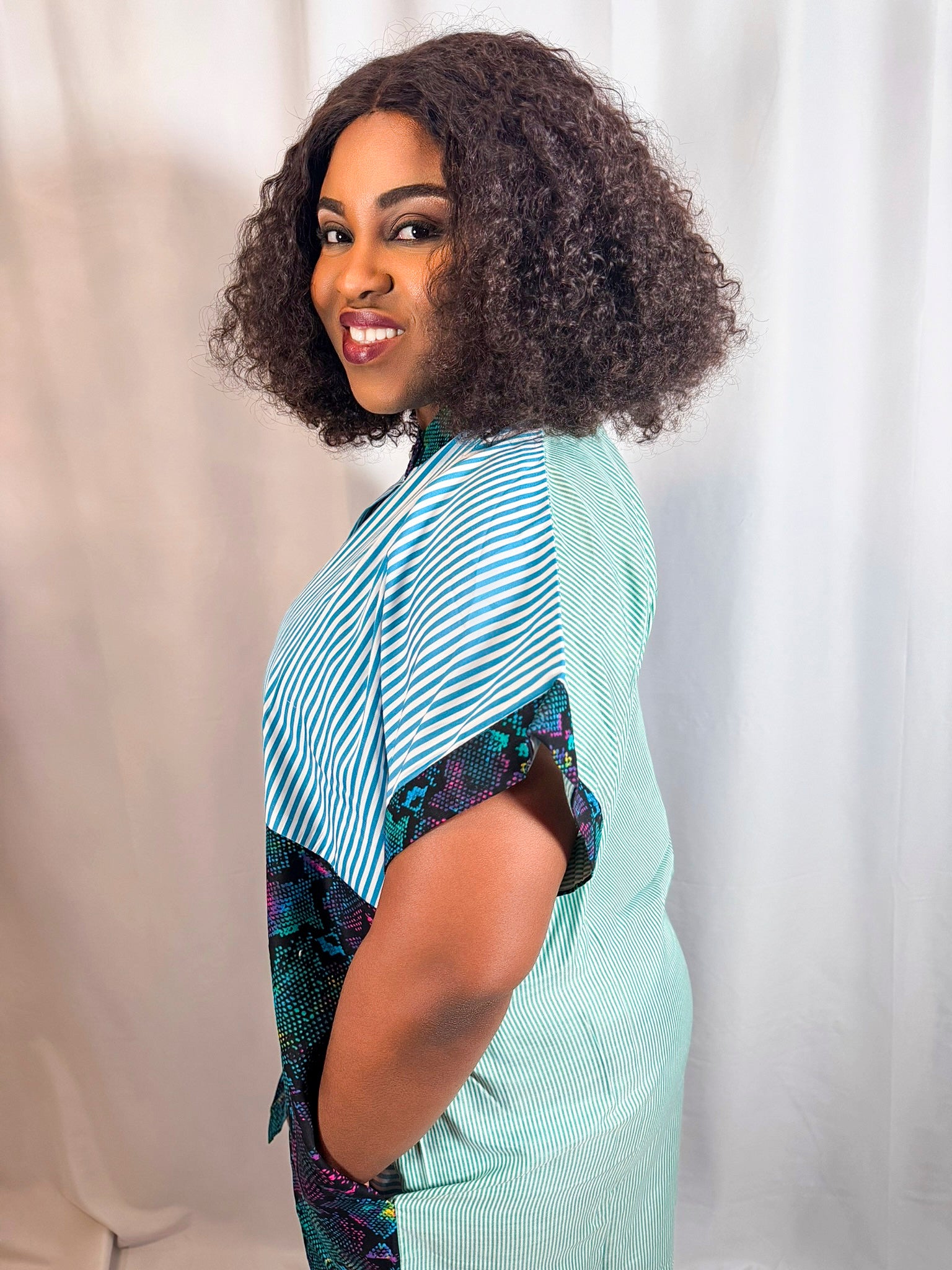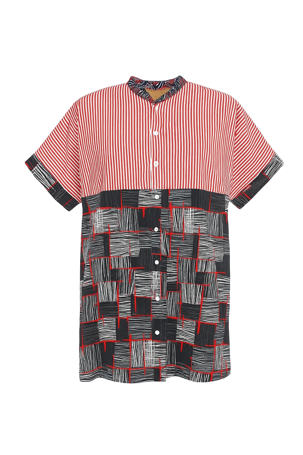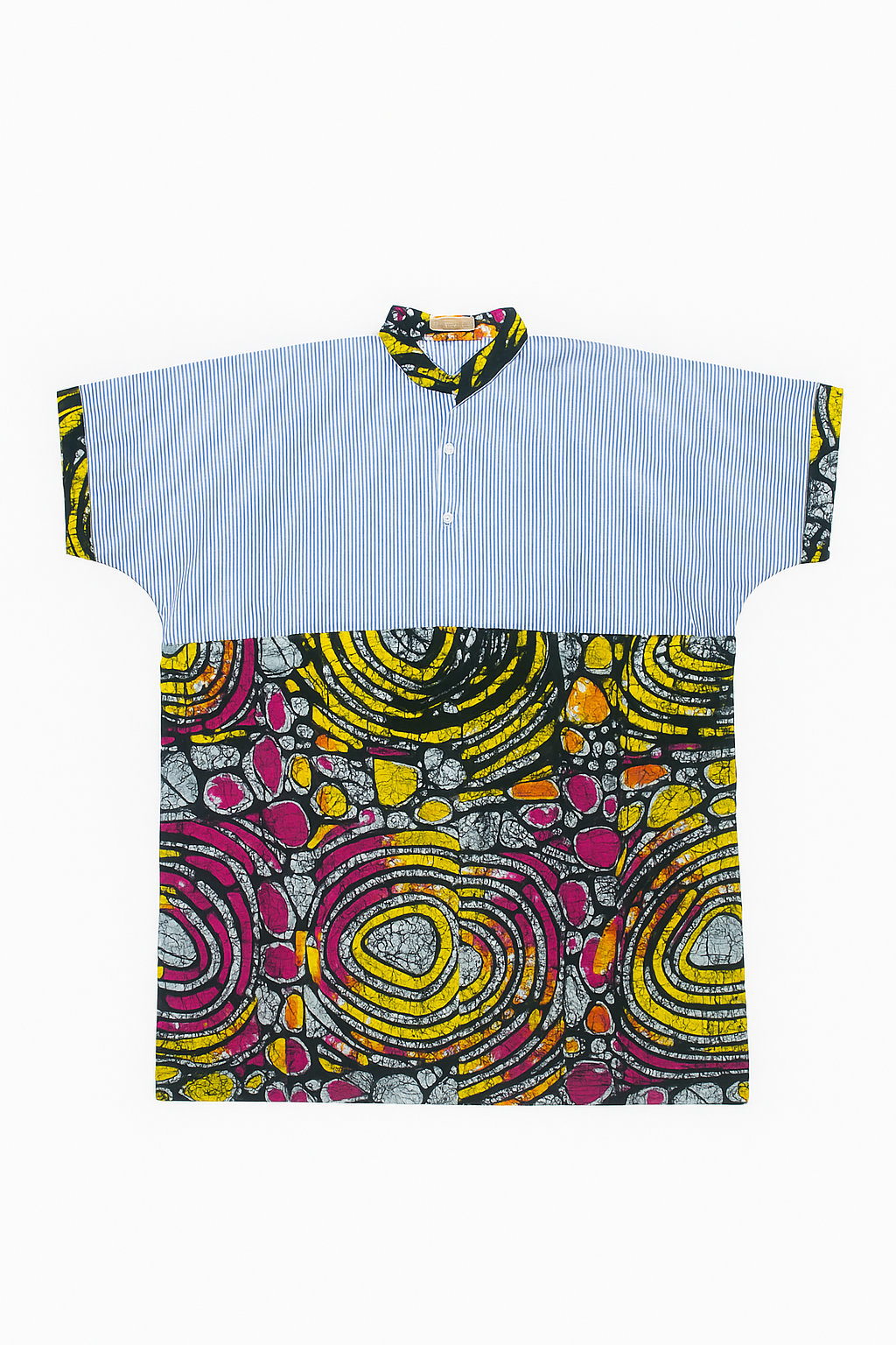 Meet your new wardrobe staple: the Striped & Ankara Shirt Dress, a playful blend of crisp shirting style and bold African print. Designed with two tones of striped cotton fabric on the front and back, and a statement Ankara panel on the lower half, this dress brings structure, ease, and personality in equal measure. The silhouette is relaxed but sharp—with short sleeves, a classic collar, front buttons, and functional side pockets for that effortlessly polished finish.
